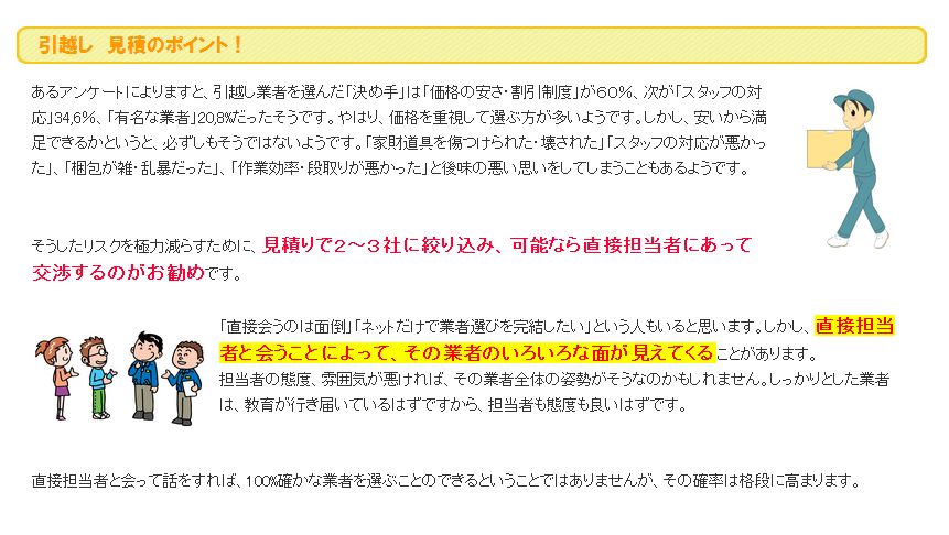 キャンペーン:キャンペーンですが様々な引っ越し業者がキャンペーンをやっています。割引をしてくれるというところもありますし。また見積もりだけで何か物をくれるというところもあるようです。そのようなキャンペーンで何か得をしたいと思っている方ならば、いろいろと探してみるといいかもしれません。 来てもらう